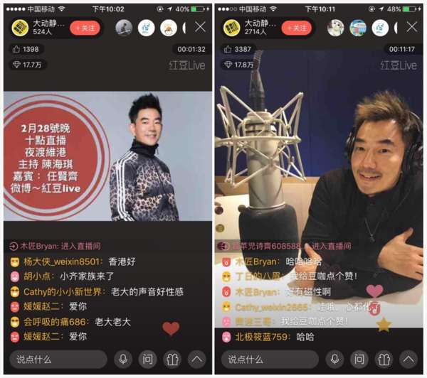- 2017年3月7日日晚,著名歌手任贤齐在语音直播平台红豆Live接受“大动静工作室”专访。在圈中拥有“亚洲天王”、“绝世好男人”称号的任贤齐近年来一直很低调,除了音乐、电影宣传鲜少接受访问,此次在红豆Live的语音直播任贤齐敞开心扉与香港知名DJ陈海琪畅聊对当代流行音乐的看法、自己的电影理想以及最喜欢的赛车,已为人父的任贤齐无论对音乐还是电影都有了更深的理解和感悟。除了与陈海琪聊天,任贤齐也通过红豆Live的评论、...