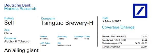 - 2017年3月4日新浪财经App:直播上线博主一对一指导新浪港股APP:实时行情独家内参德银发表研报表示,(00168)一直被认为是中国领先国产啤酒品牌,巅峰时期销售超过900万吨啤酒。目前青岛啤酒在中国有18%的市场份额,但市场变得越加复杂,青岛啤酒正在失去其竞争力。德银恢复其“卖出”评级,目标价为27.22港元。德银称,2015年青岛啤酒历史上首次失去市场份额,且此趋势在2016年持续。作为国有企业,青岛啤酒正...