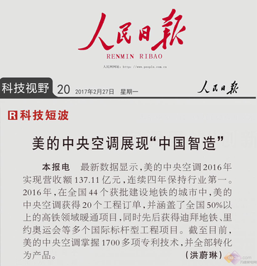 - 2017年3月1日“中国智造”》一文,点名表扬美的中央空调在过去的2016年取得的优异成绩。与此同时,美的中央空调“连续四年保持行业第一”的消息也引起了各大媒体的关注报道。新年伊始,美的中央空调便以“霸屏”之势占据行业制高点,原因何在?日前,人民日报刊登《美的中央空调展现去年是中国家电产业调整转型的关键期,而原材料震荡、上游供应链价格上涨,也使中央空调企业面临着巨大的发展压力。相较于低迷的市场环境,美的中央空调砥砺...