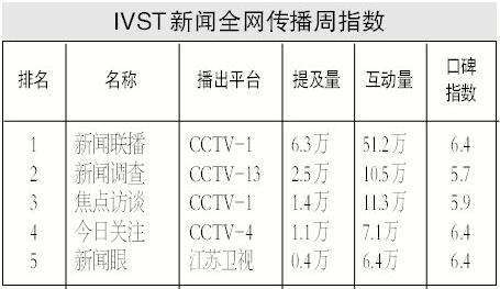 - 2017年3月1日在本周新闻节目全网传播指数排行榜中,《新闻调查》高校毕业生专题短视频在年轻群体间广泛传播,影响力可见一斑。《焦点访谈》栏目近期推出雾霾专题,从灾害原因、危害程度、治理手段及效果等多个维度出发,探讨当前自然环境态势,引发大量网友讨论。近期《今日关注》围绕东亚政治经济形势深入讨论,互动量有所上升。在本周电影全网传播指数排行榜中,动画电影《欢乐好声音》与去年火爆全球的《疯狂动物城》类似,故事剧情建立与人...