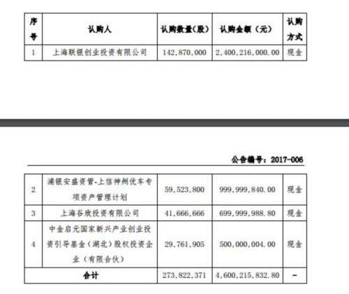 - 2017年3月1日历时近4个月的时间,发行认购延期四次,神州优车的百亿定增总算尘埃落定了。而这次定增后,神州优车的估值再上一台阶,直逼430亿元。2月28日,神州优车披露股票发行认购结果,公司以每股16.8元的价格向4名投资者发行2.74亿股股票,募资46亿。此次认购对象分别为上海联银创业投资有限公司(以下简称“联银投资”)、浦银安盛资管-上信神州优车专项资产管理计划、上海谷欣投资有限公司(以下简称“谷欣投资”)、...