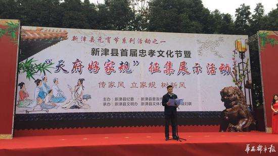 - 2017年2月26日华西都市报-封面新闻讯(记者曹笑)2月10日,“新津县首届忠孝文化节暨天府好家规征集展示活动”启动仪式,在新津纯阳观忠孝文化教育基地隆重举行,活动集中展示了新津廉洁文化建设成果,弘扬新津人民的家国情怀与家风传承。四川省纪委、成都市纪委相关领导出席启动仪式。新津县委常委、县纪委书记冯胜作了致辞讲话,介绍了近年来新津家风家训工作取得的成效,倡导广大干部群众传承好忠孝文化和“天府好家规”传统美德,推动党...