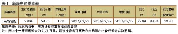 - 2017年2月24日尚品宅配2月23日开启,公司此次发行总数为2700万股,其中网上发行1000万股,申购代码300616,申购价格54.35元,发行市盈率为22.99倍,单一账户申购上限为10000股,申购数量为500股的整数倍。公司主营业务为家具零售;家具批发;厨房、卫生间用具及日用杂货批发;厨房用具及日用杂品零售;家居饰品批发;家用电器批发;商品批发贸易(许可审批类商品除外);商品零售贸易(许可审批类商品除外)...