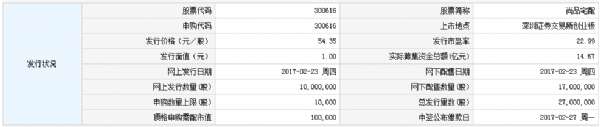 - 2017年2月24日新浪财经App:直播上线博主一对一指导证券时报网(www.stcn.com)02月22日讯据交易所安排,(603908)将于周四启动网上网下申购,具体如下:尚品宅配申购代码:300616申购价格:54.35元/股网上发行:1000万股总发行数:2700万股申购上限:10000股申购日期:2017-02-23中签缴款:2017-02-27【公司简介】公司主要从事全屋板式家具的个性化定制生产及销售、配...