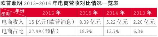 - 2017年2月23日\u00A0\u00A0\u00A0\u00A0此前,欧普相关负责人确认消息,欧普照明2016年全年电商销售额超15亿元,创下了电商销售历史新高。资料显示,欧普近几年的电商销售额也是一年一个台阶,那2016年欧普电商占比有多少?未来电商份额还会更高吗?电商业绩从8.39亿元到15亿元\u00A0\u00A0\u00A0\u00A0近期,欧普照明股份有限公司发布了《2016年度业绩快报》。报告期内,...
