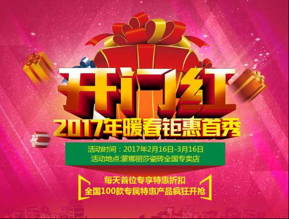 - 2017年2月21日摘要:新品墙砖免费送!蒙娜丽莎瓷砖开启暖春开市钜惠,活动期间,凡购买产品满一定金额即可免费赠送新品墙砖,暖春钜惠,不容有失。(详询当地门店)3、迎开门红,全国百款专属特惠畅销产品疯狂开抢!蒙娜丽莎瓷砖暖春开市送特惠,活动期间,蒙娜丽……蒙娜丽莎瓷砖2017年迎开门红,意大利新产品全新上市,全新风格,带你走进意大利。2017年钜惠首秀,价格狂降,服务升级,势必打响2017年第一炮!正在的您必须抓住“...