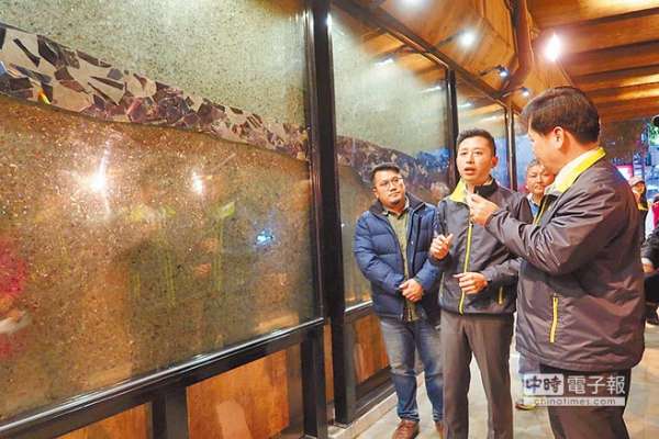 - 2017年2月21日新竹市高速公路光復路段橋下,兩側設有玻璃裝置藝術,市長林智堅(右二)日前往現勘,盼點亮暗角,為用路人帶來全新感受。(郭芝函攝)新竹市光復路高速公路橋下變美了!市府利用回收玻璃、廢棄晶圓板,將原本橋下涵洞化身晶瑩閃爍的「琉璃礦脈牆」、「晶圓河流牆」,融入新竹市玻璃、科技產業,不僅發揚在地產業、工藝,並兼具美感與飲水思源、回收再生等人文關懷,帶給民眾更多美學感受。市府投入逾344萬,邀請設計師羅傑,以...