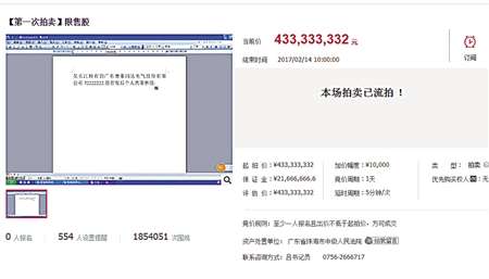 - 2017年2月16日2月13日上午10点,雷士照明创始人吴长江的部分资产在阿里旗下闲鱼拍卖平台被拍卖,由珠海市中级人民法院送拍,以归还其所欠债务。截至2月9日,两个股权拍卖标的共计已吸引432万人次的围观,成为司法拍卖史上最受关注、围观人数最高的标的。吴长江的1.3亿股德豪润达(002005,股吧)限售股(002005.SZ)被分作两个拍卖标的,按每股6元定价,起拍价分别为4.33亿元和3.47亿元,共计7.8亿元人...