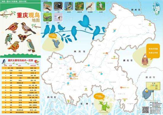 - 2017年2月16日(原标题:看鸟啦!《重庆观鸟地图》带你发现不一样的“春之美”)跟着《重庆观鸟地图》发现各种鸟儿。重庆市地理信息中心供图华龙网发(点击小图,可看大图)重庆鸟儿众多,品种丰富,跟着地图去发现它们的美丽。重庆市地理信息中心供图华龙网发华龙网2月15日15时33分讯(记者周梦莹)春风十里,除了复苏的植被,鸟儿也是一道亮丽风景线。今(15)日,重庆市规划局、重庆市地理信息中心推出《重庆观鸟地图》,整理了广阳...