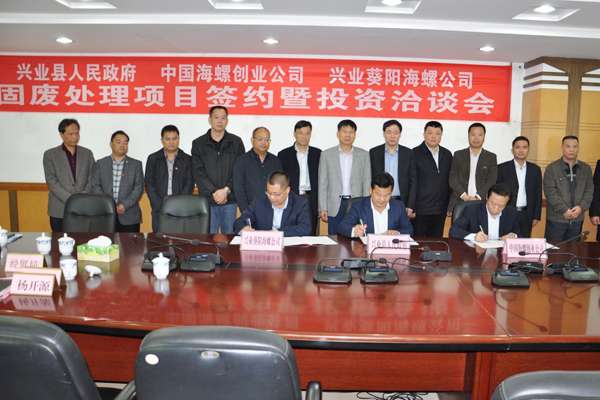 - 2017年2月15日在兴业县人民政府签署《兴业利用固废项目合作协议》。玉林市常务副市长丘德奎,兴业县县长杨开源,兴业县副县长周鸿杰,财政局、国土局、发改局、环保局、招商局、林业局、经贸局等主要负责人;海螺创业总经理纪勤应,海螺水泥广西区域副主任、兴业海螺总经理贾树堂等参加了签约仪式。该项目总规模为日处理能力600吨,分两期建设,第一期为300吨,是海螺创业在广西地区具有战略意义的项目。签约仪式后,参加人员就加快建设项...