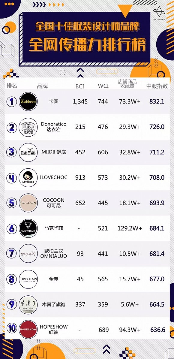 - 2018年6月1日本榜单由中国服装协会产业经济研究所作为支持单位提供指导,由中服时尚产业研究院独家发布。上升品牌:ILOVECHOC、卡宾、可可尼、欧柏兰奴下降品牌:达衣岩、红袖新晋品牌:木真了、金苑落榜品牌:蓝色倾情、纳帕佳榜单分析:卡宾夺回第一名,红袖排名下降至第10,上期落出10名外的金苑又回来了,暂时排名第8,,可喜可贺的是品牌整体传播力上升了200多个指数.2、7成品牌的自媒体选择沉默BCI指数是综合官方...