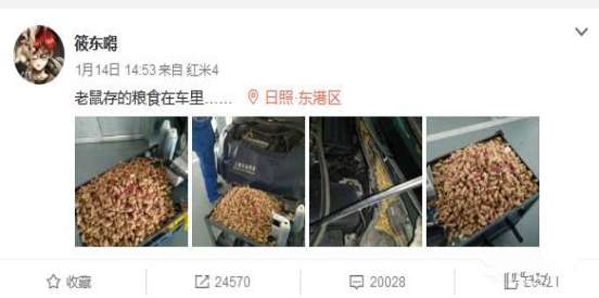 - 2017年2月4日春节前比较忙的一件事就是置办年货,吃的、喝的、玩的,反正就是买买买。仓廪实而心花怒放,看着堆成小山的年货,内心是舒畅的。但是最近报道的一则新闻,把小知逗乐了。原来不光是人,连老鼠也在偷偷置办年货,而且数量还不少,不过全被车主没收了。看到堆成小山的花生,小知内心一阵莫名的震惊。虽然逢年过节家里来的客人络绎不绝,但是小知也没有买过那么多的花生。年货被车主没收,一朝从老鼠界的土豪回到解放前,看来小老鼠这...