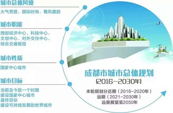 - 2017年2月2日人类,已经无法阻止成都走向世界了。近日,成都市委十二届九次全会审议通过了《成都市城市总体规划(2016-2030年)(送审稿)》。这是时隔数年后,成都启动的第五次城市总体规划修编。本轮规划明确成都的城市发展目标为:从国家中心城市到世界城市。这是继新一线城市、国家中心城市、最具幸福感城市之后,成都给自己定的小目标。▲成都市2016-2030年最新城市总体规划其中成都中心城区与天府新区,共同构建“双核...