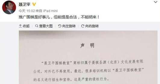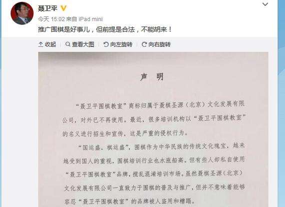 - 2017年1月31日聂卫平微博发布维权声明新浪体育讯10月21日,聂卫平通过个人微博发布了一则维权声明,称以“聂卫平围棋教室”的名义进行招生和宣传的围棋培训机构并未得到授权,严重侵权。聂卫平在发布声明是还写道:“推广围棋是好事儿,但前提是合法,不能胡来!”声明具体内容如下:“聂卫平围棋教室”商标归属于聂棋圣源(北京)文化发展有限公司,对外已不再使用。最近,很多培训机构以“聂卫平围棋教室”的名义进行招生和宣传,这是严重...