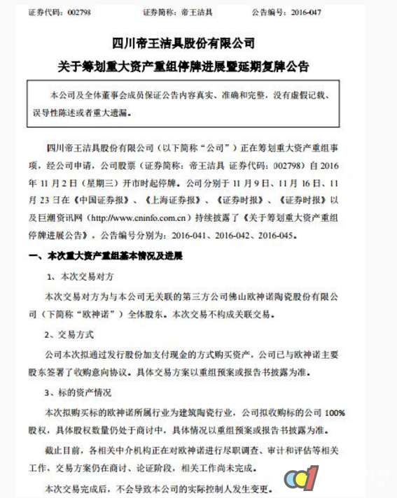 - 2017年1月30日股份有限公司(以下简称“帝王”)董事会11月30日发布《关于筹划重大资产重组停牌进展暨延期复牌公告》,腾讯股份有限公司(以下简称“”)100%的股权。帝王洁具此前于11月22日晚间发布公告公开表示帝王洁具资产重组有序推进,已与交易对方签收购意向协议,称相关各方正在积极有序推进本次重组,目前公司及交易对方签订了收购意向协议。同时,帝王洁具还发布了一则控股股东部分股份解除质押的公告,称公司控股股东、实...