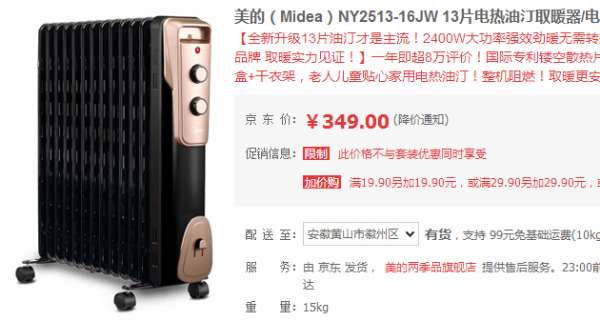 - 2017年1月29日>>科技买手,全网尖儿货打折/特卖推荐平台<<春节即将来到,寒冬依旧继续。对于怕冷的小伙伴们来说,电暖器是一个不错的选择。今天,我们为大家推荐的这款美的电暖器NY2513-16JW还算不错,它在京东拥有8万好评,产品加热速度快,使用安全,拥有13片电热片,三档可选,适用面积为21-30平方米。它采用专利镂空散热片,整机阻燃材料,2400W高效发热。其立体换热系统,双U管加热...