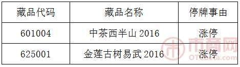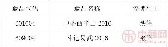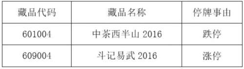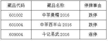 - 2017年1月29日大圆普洱交易中心发布关于《中茶西半山2016》等藏品停牌公告三分钟知汇市有图更有料财经大V实时热点投资分析黄金网微博2017年1月7日,大圆普洱交易中心发布关于《中茶西半山2016》等藏品停牌公告,经交易中心研究决定,自2017年1月9日9时30分起暂停《中茶西半山2016》等藏品交易,于2017年1月9日10时30分起恢复交易。该公告原文如下:关于《中茶西半山2016》等藏品停牌公告本中心下列藏...