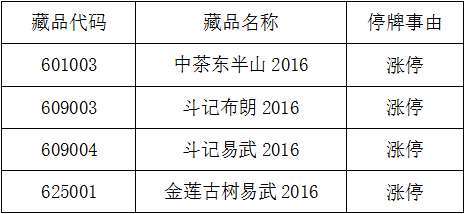 - 2017年1月29日大圆普洱交易中心发布关于《中茶东半山2016》等藏品停牌公告三分钟知汇市有图更有料财经大V实时热点投资分析黄金网微博2017年1月21日,大圆普洱交易中心发布关于《中茶东半山2016》等藏品停牌公告,经交易中心研究决定,自2017年1月23日9时30分起暂停《中茶东半山2016》等藏品交易,于2017年1月23日10时30分起恢复交易。该公告原文如下:关于《中茶东半山2016》等藏品停牌公告本中心...