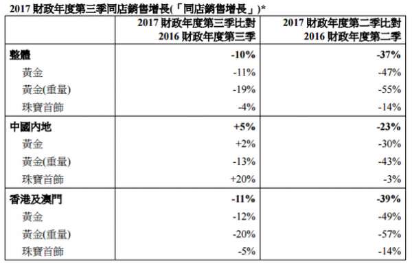- 2017年1月27日六福集团(00590)公布截至2017年3月31日止年度第三季度(2016年10月至12月)零售业务之销售表现,在基数相对较低的情况下,2017财政年度第三季零售业务同店销售增长之跌幅从第二季度的37%大幅收窄至10%。自2016年9月起,珠宝首饰产品于中国内地市场的同店销售已连续四个月取得双位数字的升幅,令其第三季同店销售从过去两个季度的负增长转为20%的正增长,加上黄金产品的同店销售亦有2%升...