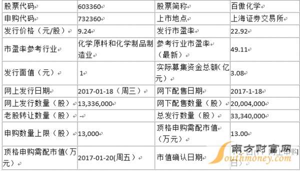 - 2017年1月19日南方财富网微信号:独家:1月18日新股奇精机械、百傲化学、金太阳今日申购指南百傲化学股份有限公司(简称:百傲化学)今日登陆上海证券交易所主板。此次A股发行总数为3334万股,该新股在网上发行总数为1333.6万股,其发行市盈率22.92倍,每股的申购价格为9.24元,其中单一帐户申购上限13000股,该申购数量1000股整数倍。百傲化学股份有限公司是行业内领先的异噻唑啉酮类工业杀菌剂制造商,主要产...