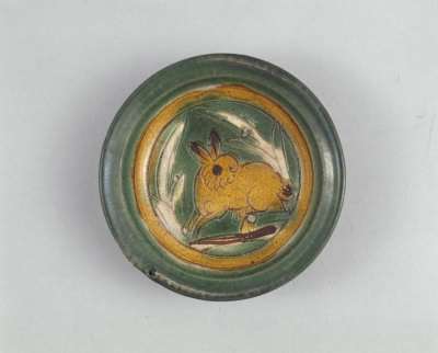 - 2017年1月19日三彩刻花兔纹小碟,辽,口径12.2cm,底径7.5cm,高3.1cm。碟外部、底部均无釉。内底刻划坡地上兔子一只,饰有刻划的花草纹,施以黄、绿、白三彩釉。小兔两耳竖起,作回首观望状,似在草丛间奔跑跳跃,自然生动。契丹族建立的辽代,国人以游牧、渔猎为生,本无陶瓷生产。随着与中原地区交往的不断深入,中原的陶瓷器和制瓷技术传入辽国,并逐渐为其掌握和发展。此件三彩器从造型、纹饰、烧造工艺等各方面可以看出所...