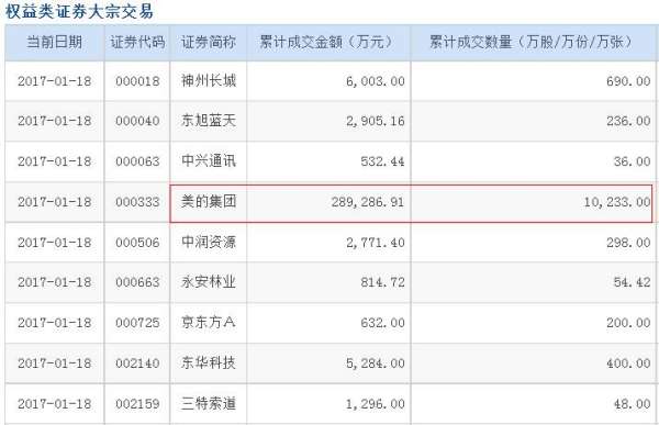 - 2017年1月19日投资实战派:叶智华讲述7年收益如何达千倍福利:天天抽奖!你准备好了吗)出现累计成交金额为28.93亿元的,创自2016年8月以来的最高纪录。其中疑似大股东减持,全部通过中金公司深圳福华一路营业部一个席位出售。交易的接盘方为多个机构专用席位。成交价格28.27元/股,较当日收盘价折价近3%。统计发现,自2016年1月1日至今,美的集团共发生了25笔超过亿元的交易,其中7笔交易金额超过10亿元。最近的...