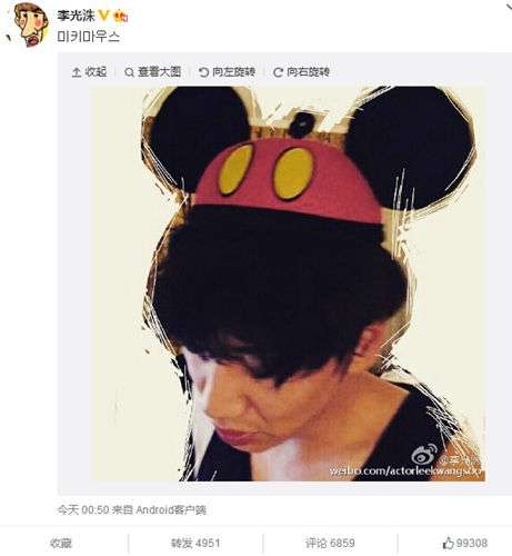- 2017年1月17日中新网6月5日电今日凌晨,韩星李光洙在微博晒出一张搞怪侧颜照,并留言,“米老鼠”。照片中,李光洙微微低头,米老鼠帽子上标志性的大耳朵让他显得可爱顽皮。对此,网友纷纷留言,“来,米老鼠露个正脸”、“你是米奇长颈鹿”、“好可爱哇”。(原标题:李光洙戴米老鼠帽子网友调侃:米奇长颈鹿(图))...