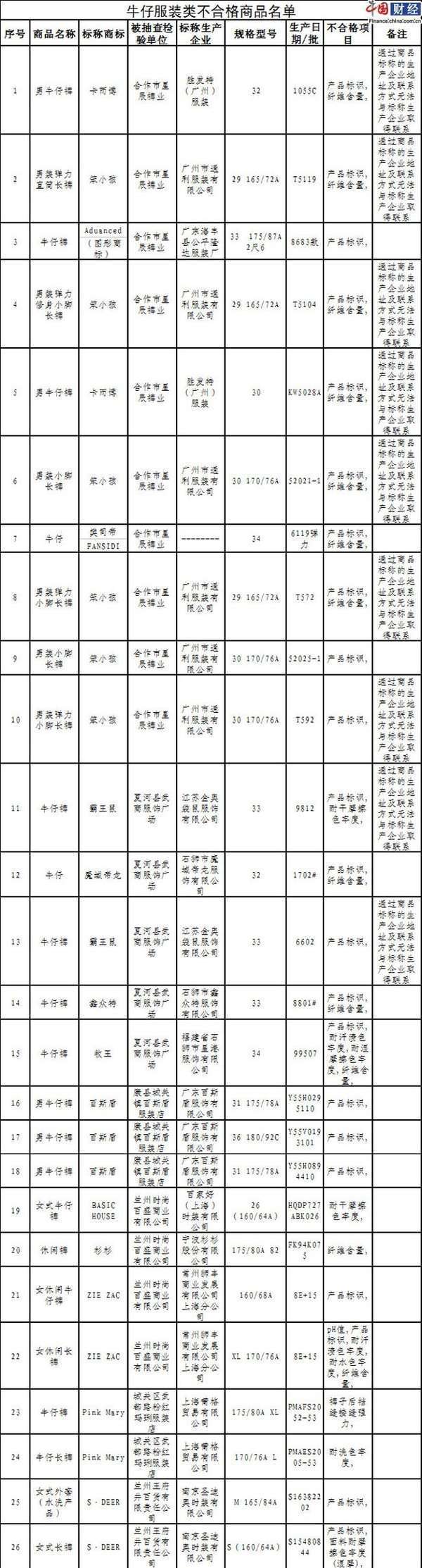 - 2017年1月15日甘肃省工商局:BASICHOUSE、杉杉等品牌牛仔服装不合格中国网财经1月11日讯甘肃省工商行政管理局网站近日公布2016年甘肃省工商系统流通领域牛仔服装类商品质量抽检结果。抽检结果显示,牛仔服装类不合格商品的质量问题主要表现在产品标识、纤维含量、耐干摩擦色牢度等不符合标准要求,涉及百斯盾、杉杉、BASICHOUSE、S·DEER等品牌。中国网财经1月11日讯甘肃省工商行政管理局网站近日公布201...