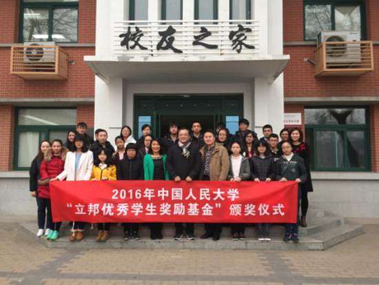 - 2017年1月15日中国人民大学2016年“立邦优秀学生奖励基金”颁奖仪式在人民大学举行,今年共有20名大学生获得了奖励基金。立邦中国建筑涂料事业群副总裁兼公关中心主管孙荣隆为优秀学子授予了基金;中国人民大学基金会副秘书长王志成、中国人民大学学生处资助办副主任陈虹百出席仪式。“立邦优秀学生奖励基金”由立邦公司创始人吴清亮先生出资于2005年设立,希望通过实际帮助,减轻孩子们的生活和学业负担,持续资助人民大学家境困难的...