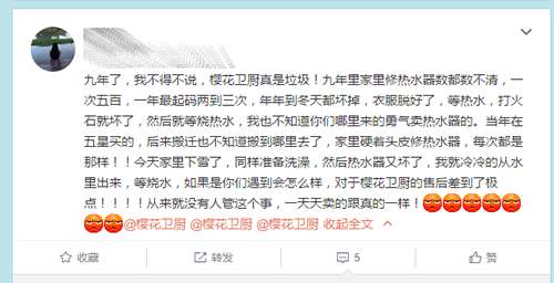 - 2017年1月11日冬天来临,冷空气不断肆虐陆地。冷空气带来的直接变化,就是天气不断变冷,温度不断下降。随着冷空气的到来,热水器市场迎来火爆的现象。不过,对于消费者而言,寒冷的冬天不可怕,更可怕的是品牌的维修。不作为的维修才真正令消费者心寒。【家电网HEA12月27日原创】有位名叫“我就是我”的网友在网络上留言称,他家已经买了樱花卫厨的热水器九年了,樱花卫厨真是垃圾!九年来家里修热水器维修次数数都数不清,一次五百,一...