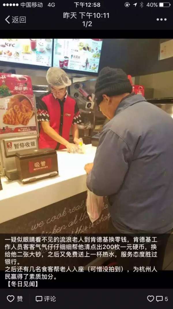 - 2017年1月8日央广网杭州1月6日消息1月2日,杭州的王先生在自己朋友圈里晒了两张照片,收到了无数的点赞。很多人看完之后,都感觉在这个冬日里,有一股浓浓的暖意涌上心头。原来,前一天晚上,王先生下班后,到位于杭州湖墅南路的肯德基红石餐厅就餐,走进餐厅看到,柜台前的小伙子正在认真地帮一位老大爷清点硬币,然后把兑换好的两张百元纸币交到大爷手中。肯德基小伙子为老大爷兑换200元硬币“当时差不多10点半的样子,我去肯德基买...