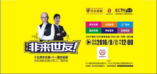- 2017年1月8日世友地板,地处“中国木地板之都”浙江南浔,是中国地板行业的领军企业,也是亚洲地区规模最大的地板企业之一。至今为止,已经有15年的发展历史,本着“创新求发展”作为企业发展战略,世友地板每年都开展各类促销,放价活动,最大限度回馈消费者!继6月19日世友地板主办的全国促销活动过去已经2月有余,错失购买良机的消费者,你们的福音来啦!“非来世友”第二季即日起在全国各世友地板门店开启,9月24日重庆南坪国际会...