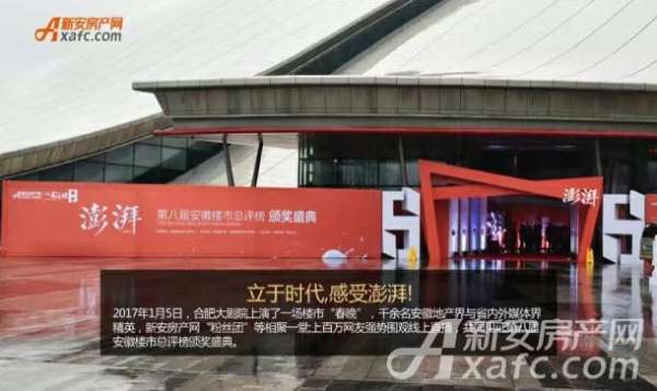 - 2017年1月8日1月5日,由新安房产网主办的第八届安徽楼市总评榜在合肥大剧院盛大举行,来自安徽各地数十家开发房企齐聚一堂共同见证这一盛况。持续近两个月,引千万人次关注,由安徽省房地产协会指导,新安房产网与合肥学院房地产研究所联合主办的,本年度最受瞩目的“澎湃”2016—第八届安徽楼市总评榜颁奖盛典于2017年1月5日在合肥大剧院华丽启幕!第八届安徽楼市总评榜千余位地产界业内人士、专家学者、主流媒体齐聚一堂,共同见...