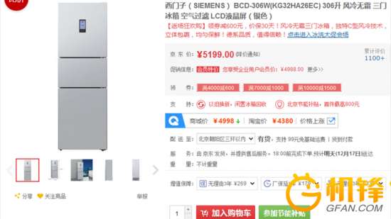 - 2017年1月2日【家电行情】12月16日,西门子(SIEMENS)BCD-306W(KG32HA26EC)306升风冷无霜三门冰箱采用空气过滤LCD液晶屏风冷无霜三门冰箱,独特C型风冷技术,立体包裹,均匀保鲜,德系品质,值得信赖。西门子(SIEMENS)BCD-306W三门冰箱现在京东售价至5199元,领取页面的满4000减600优惠券,实际价格4599元,有需要的朋友可以考虑。...