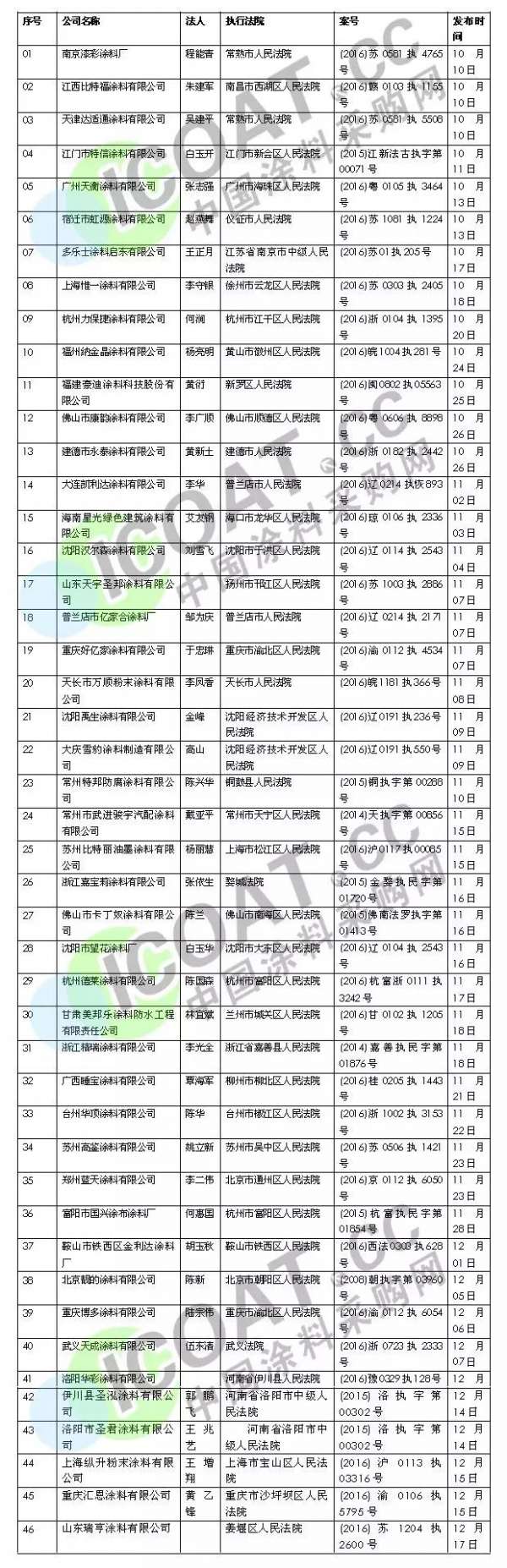 - 2016年12月31日“人无忠信,不可立于世”,对于企业来说也是如此。诚信是一个企业生存和发展的基石,很多企业在发展的过程中,往往把诚信看得特别重要,但是当诚信遇上利益之后,很多企业都是以利为先,诚信则被完全忽视,这也是目前很多国内涂料企业无法走向国际市场的重要原因。据中国涂料采购网统计,2016年第四季度被通报的失信涂料企业高达到46家,其名单如下:2016年第四季度全国涂料失信企业名单据不完全统计,2016年以来,...