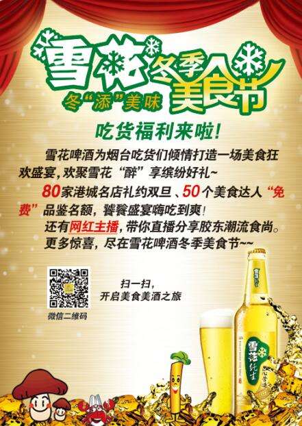 - 2016年12月29日严峻的寒冬,美食欲望揭竿而起。雪花啤酒响应美食热力号召,携手烟台日报社、水母网及胶东在线等知名媒体为港城市民倾力打造舌尖上的饕餮盛宴。雪花啤酒冬季美食节冬添美味火热开幕!现广邀美食界各路达人,带着您对美食的热情参与盛宴。雪花礼约双旦,醉爽惊喜好礼,为回馈烟台市民多年来对雪花啤酒的支持,主办方将在圣诞及元旦期间推出“欢聚雪花,点亮新年,惊喜好礼奖不停”有奖促销活动。即在活动期间内,在指定的餐饮店消费...