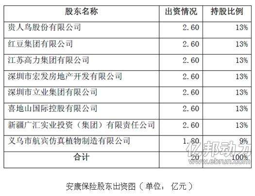 - 2016年12月25日昨日,贵人鸟发布公告称,公司拟与新疆广汇实业(集团)有限责任公司、红豆集团有限公司等7家公司共同发起设立安康人寿保险股份有限公司(以下简称“安康人寿”)。DT电商了解到,安康保险注册资本拟定为人民币20亿元,全部注册资本为等额股份,其中包括贵人鸟在内的7家公司各出资2.6亿元,各占安康保险股本总额的13%,而制造有限公司出资1.8亿元,占股9%。DT电商了解到,安康保险的经营范围包括全部人身保险业...