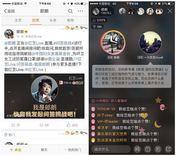 - 2016年12月25日12月15日晚,国际钢琴家、联合国和平大使郎朗参与由红豆Live与微公益发起的“问答挑战”大型公益直播活动。直播中,郎朗热情回答了网友付费提问的关于钢琴演奏、新专辑等各类问题,并在网友的要求下,用东北话给网友拜早年。整场直播显得非常放松,受到不少网友的留言称赞。红豆Live数据显示,直播当天在线参与人数达到234万人,直播结束12小时内回放量也超过460万人次。截至目前,累积播放量达到700万。最...