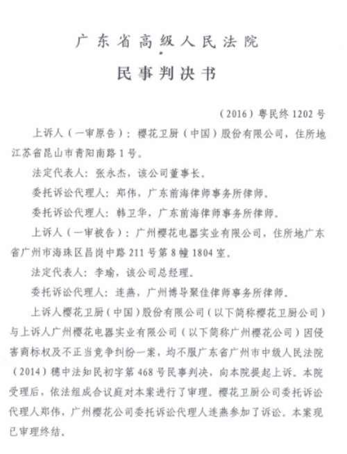 - 2016年12月20日近日,SAKURA樱花与广州樱花维权大战尘埃落定,SAKURA樱花大获全胜!广东省高级人民法院做出终审判决:广州樱花被判商标侵权,反不正当竞争成立,并要求广州樱花变更企业名称,不能用“樱花”作企业字号;立即停止在其生产、销售或授权他人生产、销售的卫厨、卫浴及相关电器产品上使用“樱花”标识。同时,广州樱花还将赔偿樱花卫厨(中国)股份有限公司200万元并承担所有诉讼费用。维护市场公平与正义“打假维权”...
