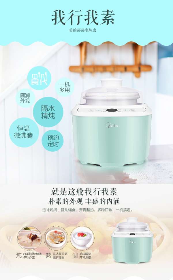 - 2016年12月20日>>科技买手,全网尖儿货打折/特卖推荐平台<<美的专注于持续的技术革新,以提升产品及服务质量,令生活更舒适、更美好。美的的家电产品一向是有口皆碑的,不但结实耐用,而且物美价廉。这里要推荐的这款美的电炖锅MD-WBZS101XL-G为薄荷绿与瓷白相间的机身配色,清新淡雅,人见人爱。产品非常小巧,放到厨房中一点也不占地方。它材质天然,无异味,防烫耐用,外观简约大方,功能多样,操...