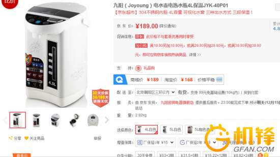 - 2016年12月18日【家电行情】12月14日,九阳(Joyoung)电水壶电热水瓶4L保温JYK-40P01采用304不锈钢内胆、4L容量、可视化水窗、三种出水方式、三段保温。目前该产品在京东售价189元,有需要的朋友可以关注。...