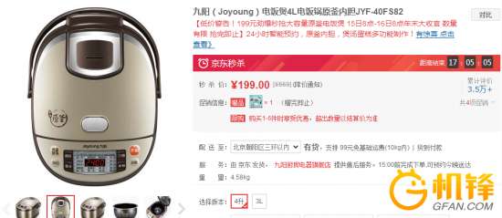 - 2016年12月18日【家电行情】12月15日消息,九阳电饭煲拉丝彩钢机身和原釜内胆,容量4L,商品毛重为4.58kg。环形弧度加热,受热均匀。具有24小时智能预约、火力控制和对流煮等功能。此外,可拆卸蒸汽阀、可拆洗内盖、内盖凹点设计,清洁更加便利。LED显示屏和。可旋转提手方便你的使用。原价569元,京东优惠价199元,下单即送礼品。时间仅限今天一天,有需要的不妨考虑一下。...