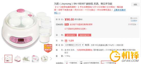 - 2016年12月18日【家电行情】12月12日消息,九阳酸奶机尺寸为296*256*226mm,额定功率为15W,是一款可实现酸奶、纳豆和米酒一机多用的产品。容量为1.5L,适用于2-5人使用。采用360度恒温立体发酵,微电脑控制,将会有结束铃音提醒。全俯视面板,使操作过程简明了。贴心阀门设计,在关闭阀门时,可以做酸奶和米酒,开启阀门后便可以制作纳豆。此外,本款产品外搭4个玻璃分杯,让你方便携带酸奶。京东优惠价98元,...
