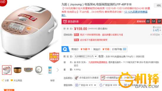 - 2016年12月18日【家电行情】12月12日,九阳(Joyoung)电饭煲4L电饭锅智能预约JYF-40FS18不沾内胆,24小时预约按键式电脑版操作方式,底盘加热,煮饭煲汤多功能智能电饭煲。159元,12日10点-13日10点京东劲爆秒抢24小时,有需求的用户可以关注。...