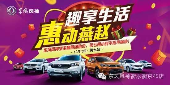 - 2016年12月16日厂家与您相约衡水巨林店,感受风神钜惠洒满燕赵的震撼时刻!届时东风风神全系将为您献上全河北省最优惠的价格,厂家岁末直销节省了中间环节,给您最大的价格空间,最优的品牌体验,最放心的质量保证,最疯狂的购车惊喜,最执着的专业服务,缩短东风风神到您的距离!【签到有豪礼】:好车网线上支付99元意向金,到场即送车载吸尘器一件!【循环抽奖礼】:现场订车可参与循环抽奖(中奖客户仍可参加后面抽奖),一等奖:豪华按摩椅...