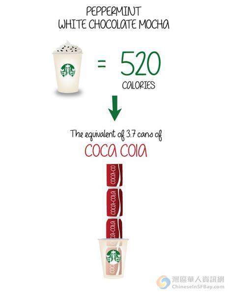 - 2016年12月14日点击上方,关注顶尖运动微刊哦!整理自湾区华人资讯网和潮NYC童鞋们都很爱喝星巴克,但是却很少关注它超高的卡路里含量。一个非常有才华的咖啡专家想到了用对比的方式去量化星巴克的卡路里指数。大家睁大眼睛一起来“受惊吓”吧!喝了一杯薄荷巧克力摩卡就等于喝了3.7罐的可口可乐?一杯巧克力星冰乐的卡路里等于120颗彩虹糖。。。喝一杯暖身暖心的热巧克力等于一口气磕掉45颗小熊软糖!貌似很健康的绿茶拿铁和一个中型...