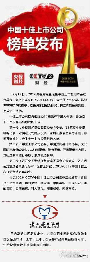 - 2016年12月14日12月12日,2016央视财经论坛暨中国上市公司峰会在京举行,会上正式发布了2016CCTV中国十佳上市公司。龙头企业,占据白酒市场制高点,称雄中国极品酒市场,上市十五年,在保持产品高端品质的同时,也给投资者带来持续丰厚的回报,荣誉入榜。这份3000选10的榜单,以投资者回报为标尺,树立价值投资典范,完成优中选优。...