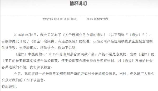 - 2016年12月14日原标题:国酒茅台(贵州仁怀)营销有限公司的情况说明2016年12月6日,国酒茅台(贵州仁怀)营销有限公司发布了《关于近期业务办理的通知》(以下简称《通知》),部分媒体据此刊发了《酒企年底限供、有违法嫌疑》的报道,认为公司产品短期缺货系企业刻意限制供货所致原标题:国酒茅台(贵州仁怀)营销有限公司的情况说明2016年12月6日,国酒茅台(贵州仁怀)营销有限公司发布了《关于近期业务办理的通知》(以下简称...