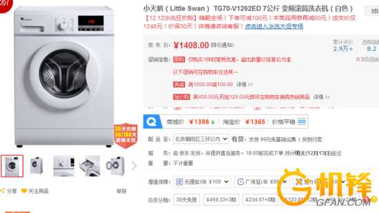 - 2016年12月14日【家电行情】12月12日,小天鹅(LittleSwan)TG70-V1262ED7公斤变频滚筒洗衣机上排水、筒自洁,羊毛洗;支持脱水功能、防缠绕、儿童安全锁、预约功能、电辅加热洗涤、自动断电、智能断电记忆、排水阀漏水保护、进水阀漏水保护等功能。产品尺寸(深×宽×高)490*595*850mm。12.12冰洗狂欢购下单可减100元,本商品用券再减60元,成交价仅1248元,价保30天。有需求的用户可...