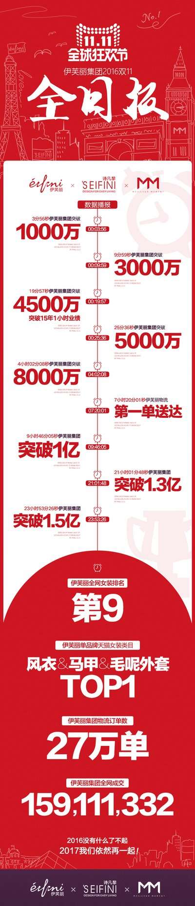 - 2016年12月14日社/--中国领先的时尚女装品牌公司伊芙丽在2016年双11当天表现亮眼,集团三大品牌EIFINI伊芙丽、SEIFINI诗凡黎、MM麦檬在双11当天全网销售突破1.59亿元,同比增长59%,其中主品牌EIFINI伊芙丽达到1.2亿元,位列全网女装类目第九名,同时毛呢大衣、马甲、风衣位居天猫女装品类TOP1。全天订单量达到36万单,覆盖全国33个省(市)自治区,362个城市,最远发至香港、台湾等地区,...